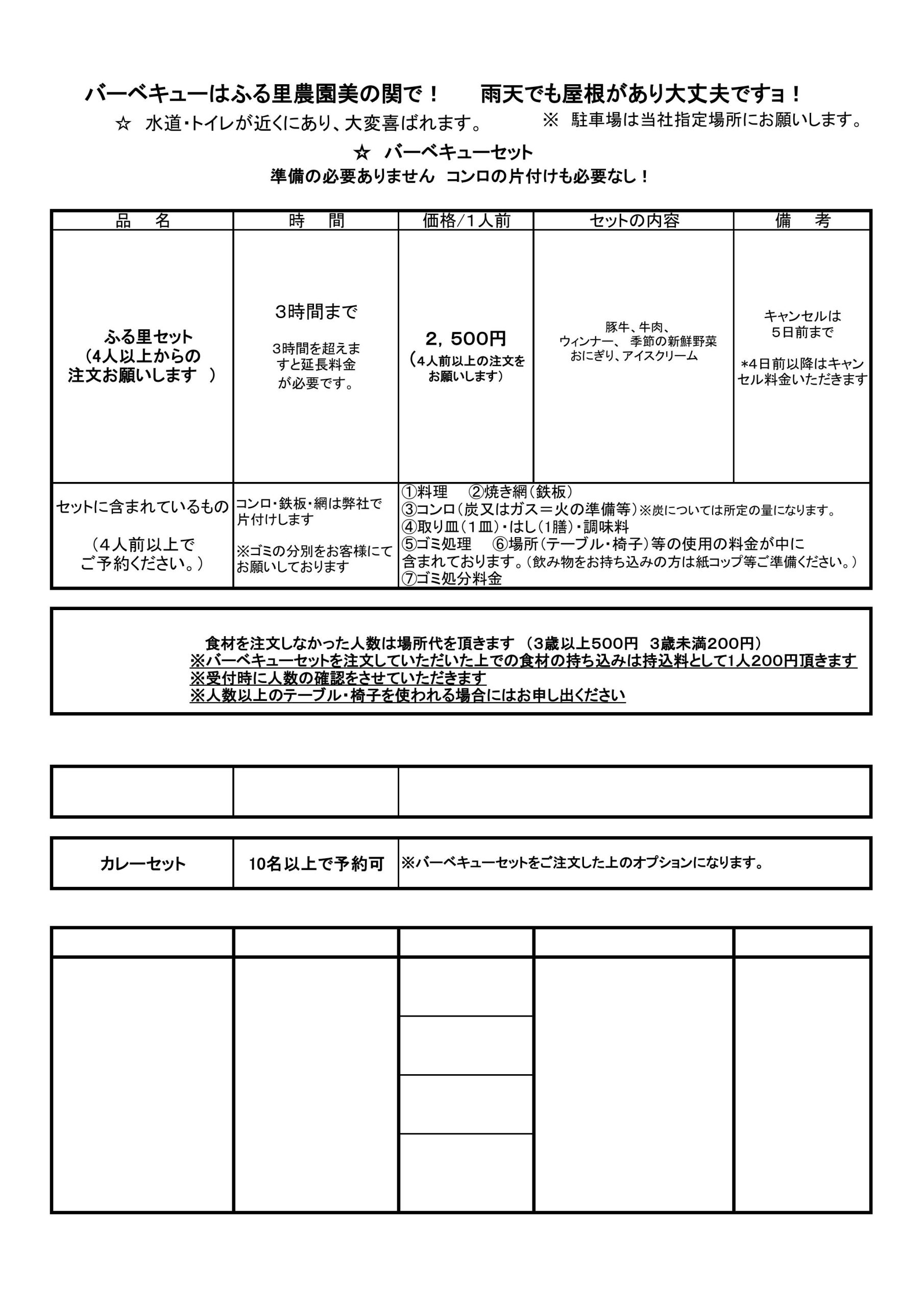 料金に含まれるもの:コンロ、網、鉄板、場所(テーブル・椅子)、ごみ処分
